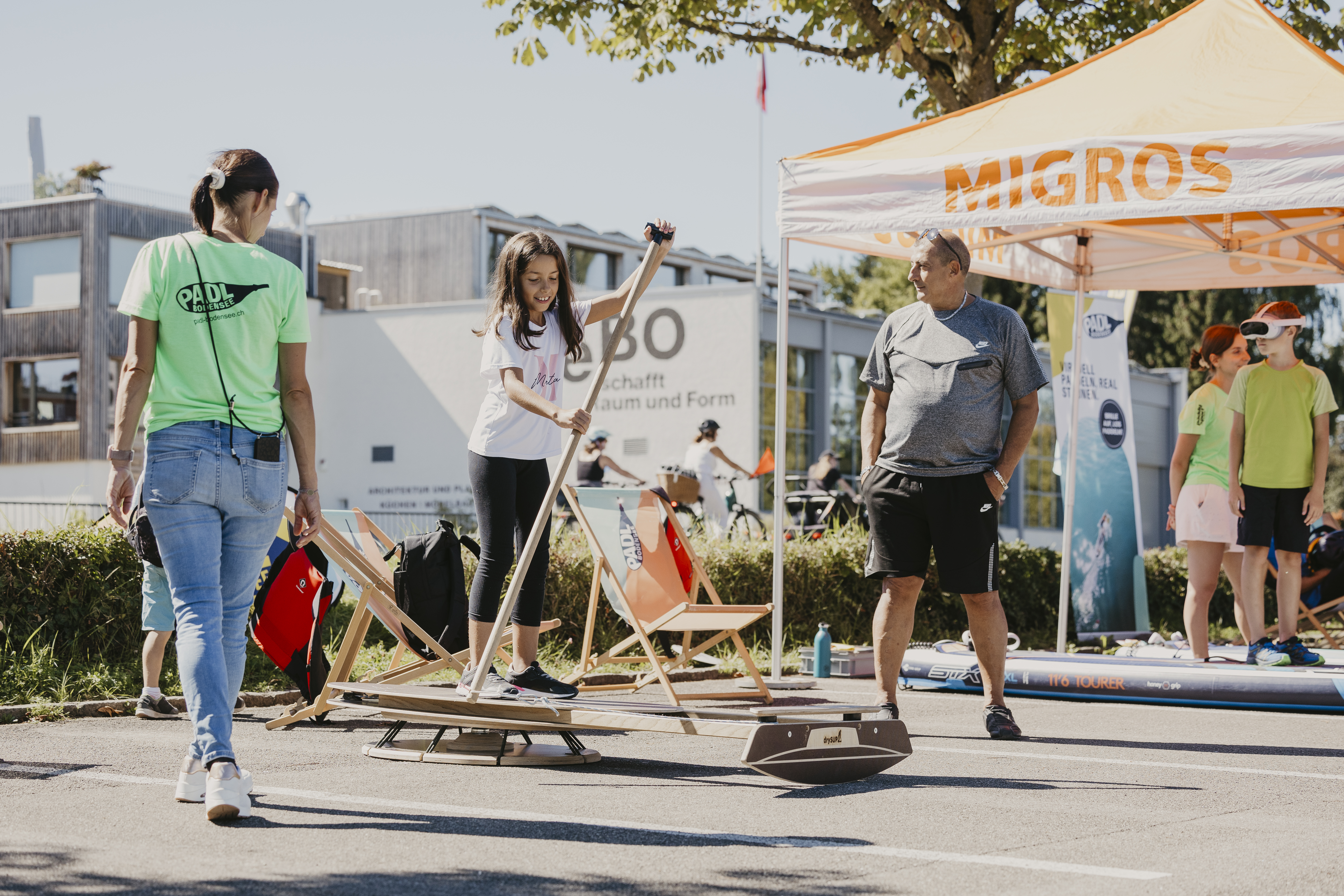 In Steinach erwartet dich am slowUp Bodensee ein spritziges Highlight: die PADL-Wassersportzone direkt am Hafen. Hier kannst du Stand-up-Paddling auf neue Art erleben – trocken auf dem SUP-Ergometer oder virtuell mit der VR-Brille, die dich mitten auf den Bodensee katapultiert. Das PADL-Mobil ist mit Informationen und Ausrüstung vor Ort, regionale Sportanbieter zeigen die Vielfalt des Wassersports im Thurgau. Einfach vorbeikommen, ausprobieren und neue Lieblingssportarten entdecken – ganz im Zeichen von Bewegung, Spass und Sommerfeeling.