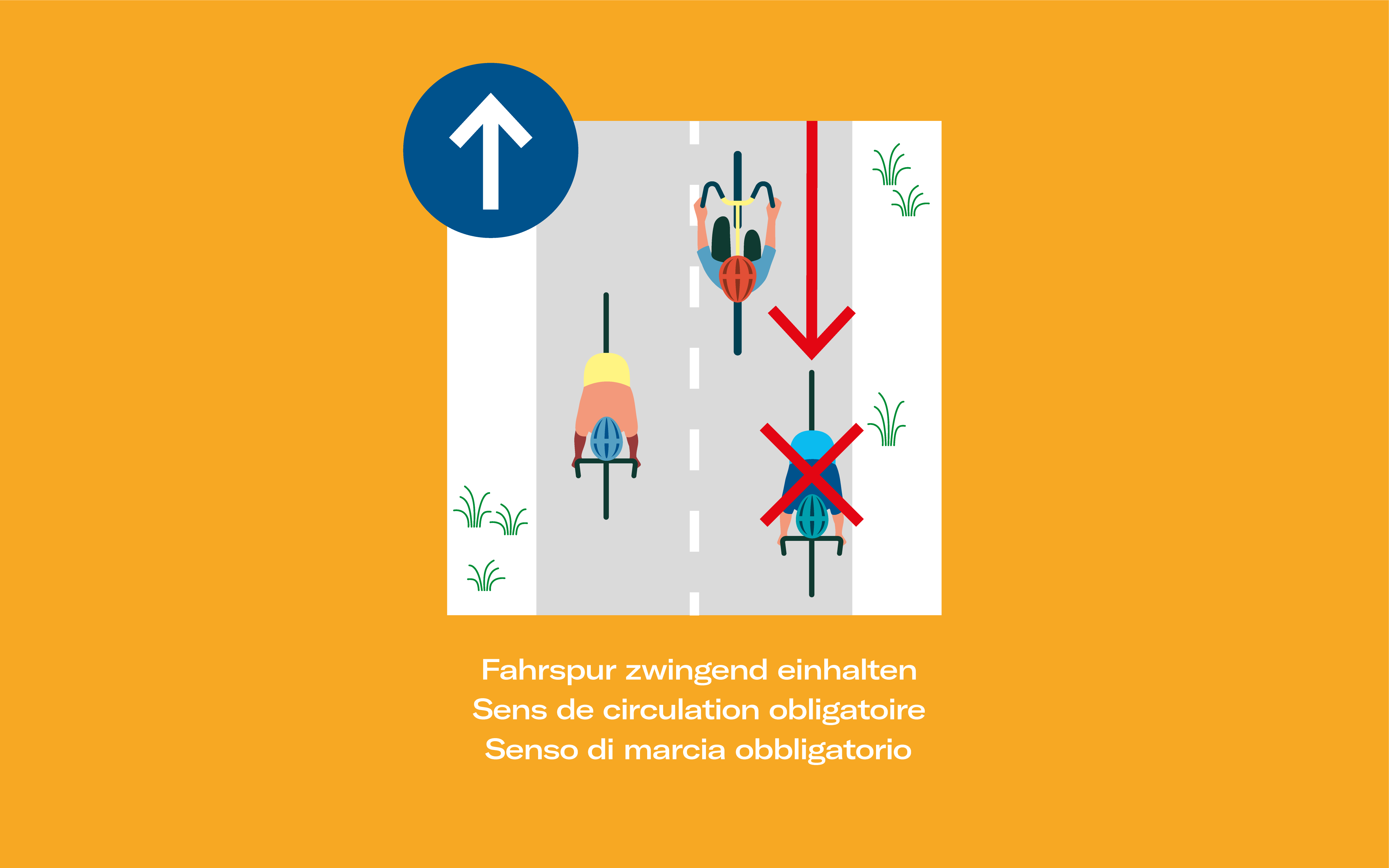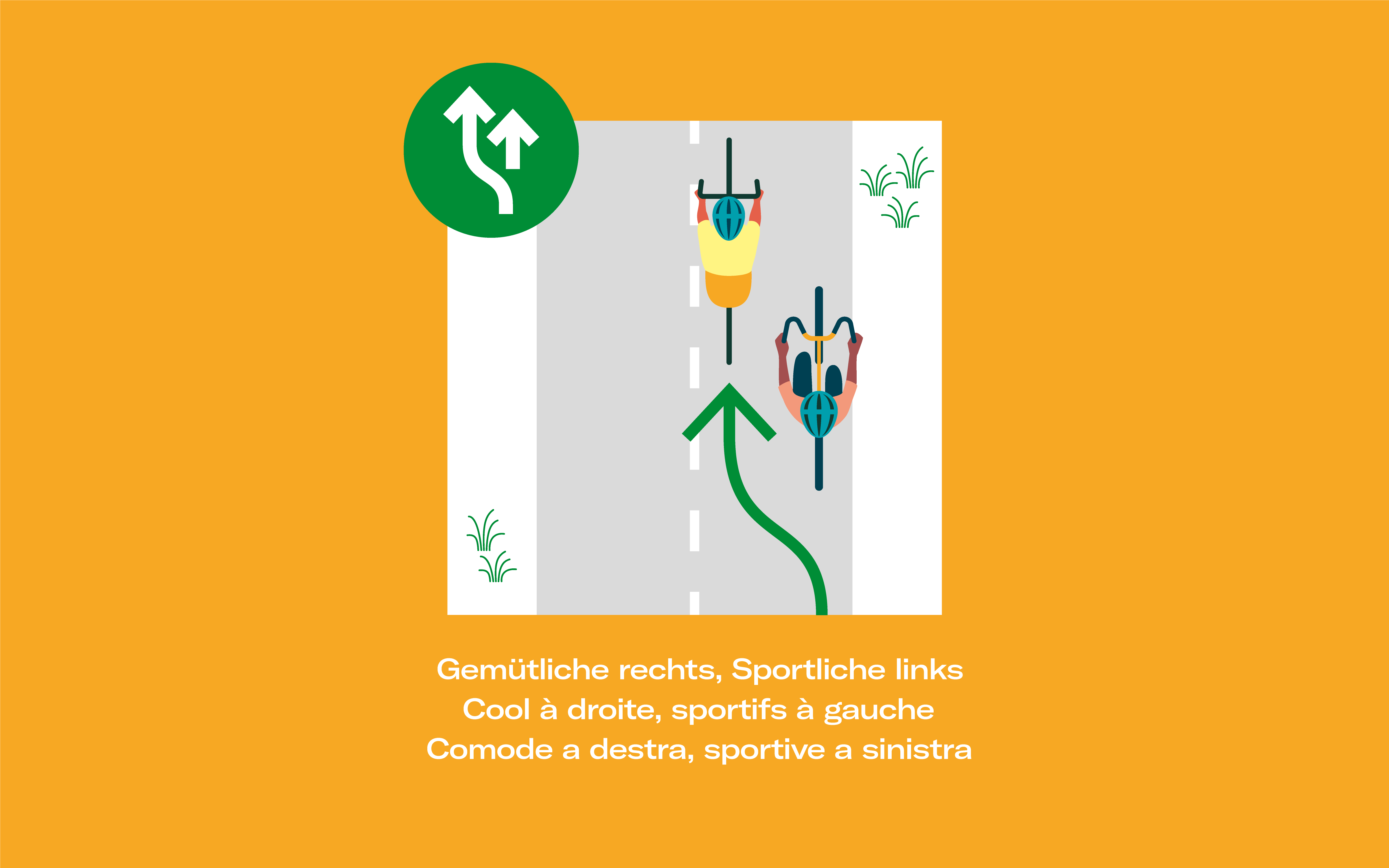 - Die slowUp-Route kann in beiden Richtungen befahren werden. Rechtsverkehr (mit der Mittellinie als Trennlinie) ist ein Muss.